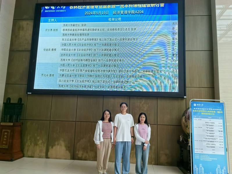 为进一步推进教育部农业经济学课程虚拟教研室建设工作,深化高等教育教学改革,提高教学质量,树立课程建设新理念,点燃课堂革命新引擎,2024519日,教育部农业经济学课程虚拟教研室与西南大学Bet365官网 在重庆联合举行“农业经济管理类专业国家级一流本科课程建设研讨会”。Bet365 蒲娟、王艺洁、郭琳三名青年教师代表参加了研讨会。