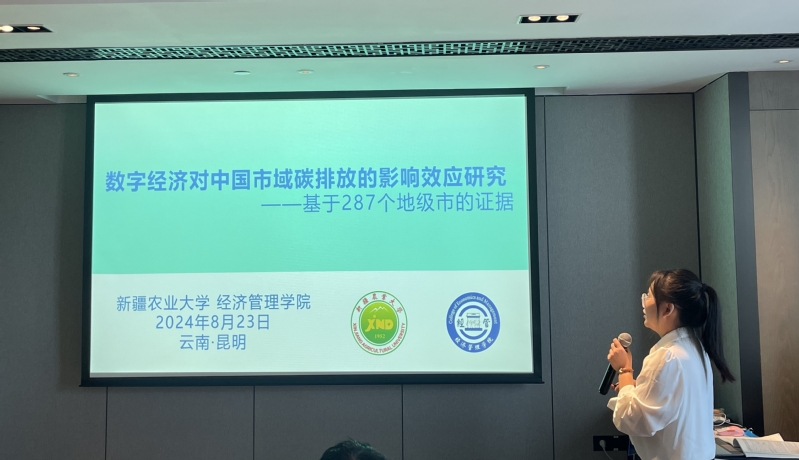 来自Bet365 农经2103班的蒋婉婷同学在本次年会上进行了题为《数字经济对中国市域碳排放的影响效应研究》的征文报告。作为新兴经济社会发展形态,数字经济在提高能源利用效率、促进居民低碳生活与完善政府治碳体系等方面发挥着巨大作用。在“双碳”目标已上升至中国发展战略高度的大背景下,文章围绕数字经济发展对带动的碳排放量有何影响?其变化趋势如何?又会产生怎样的效应?紧密展开。运用定性和定量的方法详细分析了数字经济对碳排放的影响效应、区域差异以及空间溢出效应。征文汇报后,专家进行了点评。