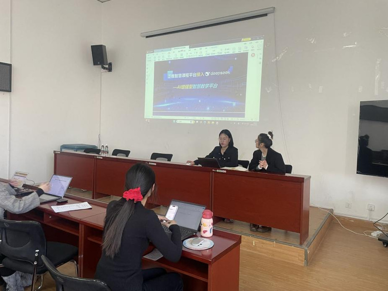 培训以泛雅智慧课程平台接入DeepSeek智能教学系统为核心,围绕“课前—课中—课后”全流程教学场景展开。刘鑫雨、许晴老师重点演示了AI工具箱的实践应用:教师可通过“AI出题”功能自动生成多样化练习题,利用“AI课件”一键创建P等;而“知识图谱”模块则能将零散知识点串联为逻辑体系,帮助学生构建系统化知识框架,显著提升学生学习效率。